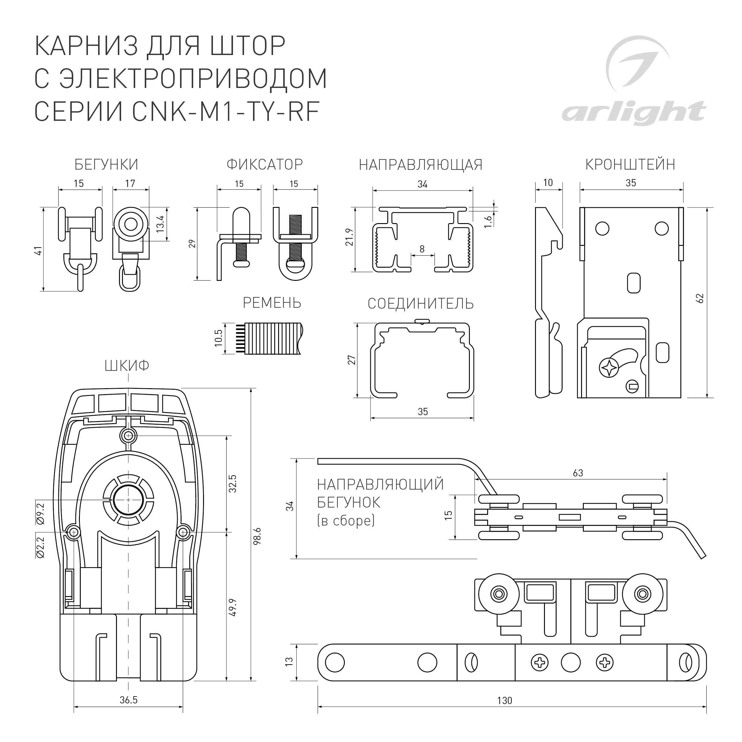 1 мотор, 1 пульт дистанционного управления, алюминиевый профиль 1,6 мм (1м - 3шт, 0.5м - 1шт, 0.2м - 2шт., 0.1м - 1 шт.), 3 соединителя 10 см, 1 соединитель 20 см, 1 переходник 5 см, 2 шкива, 2 пряжки ремня, 2 направляющих бегунка, ремень 8,4 м, 24 бегунка, 2 фиксатора, 8 кронштейнов, 1 зажим на ремень