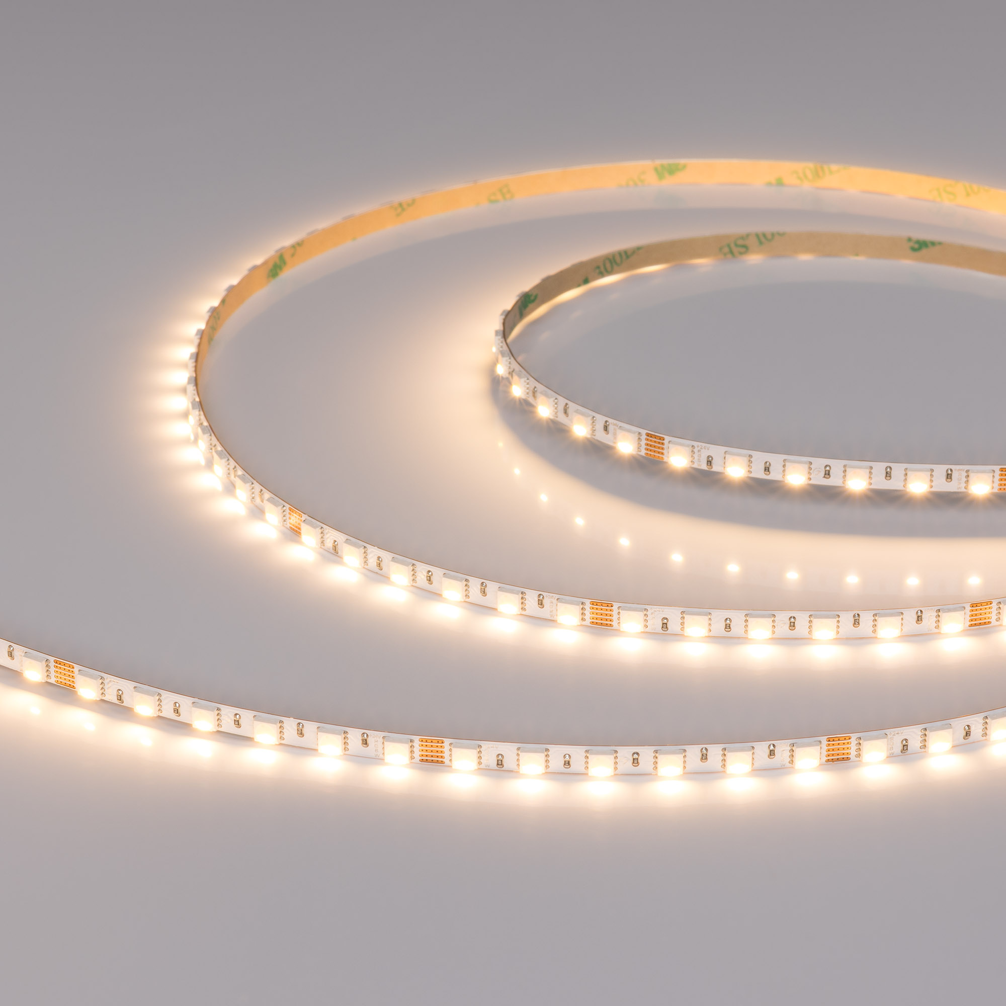 Светодиодная узкая лента RT серии H96. Светодиоды SMD 4040, 96 шт/м, белая плата, ширина 5 мм, скотч 3M. Цвет RGB + ТЕПЛЫЙ 3000K, индекс цветопередачи CRI>90, угол 120°. Питание 24 В, мощность 10 Вт/м (50 Вт на 5 м). Размеры 5000x5x2 мм, мин. отрезок 62.5 мм, 6 светодиодов. Цена за 1 м. Обязательна установка на профиль.