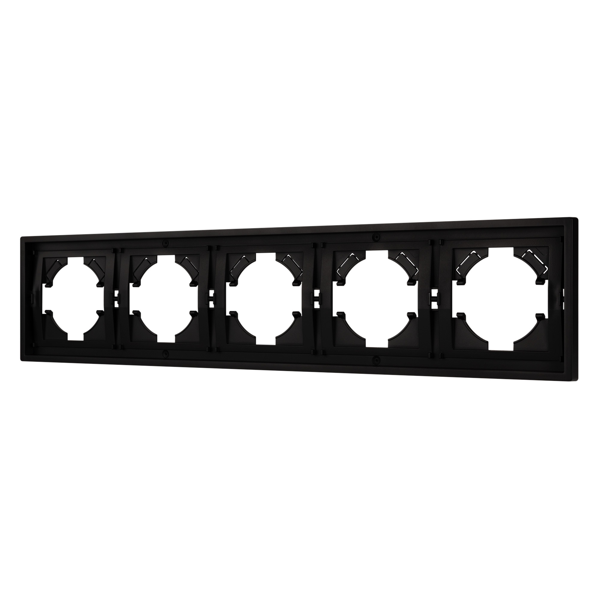 Рамка пластиковая на 5 постов, под встраиваемый механизм. Цвет - черный. Среднего уровня герметичности IP20. Ориентация монтажа горизонтальная.